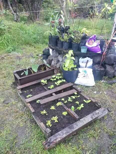 empezó un jardín de material reciclado con cosas que encontré en mi propiedad; saltos de madera y viejos neumáticos de un antiguo rodillo de alambre como una tabla wa de la. Vivir fuera de la red en Hawai rural con gas precios nubes he recogido un montón de plántulas de hortalizas, gallinaza, compost y suelo y poner em.
