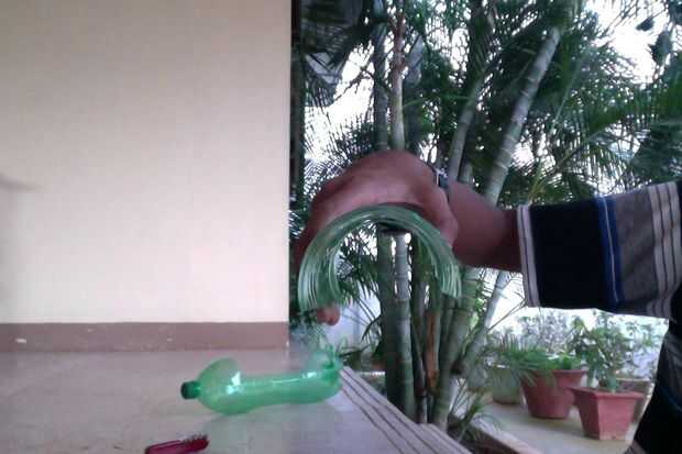 Si no han cortado de la botella correctamente, tome el pedazo sobrante de otra botella que se corta correctamente y grapa firmemente para que el 60% de la botella se cubre para arriba. porque el suelo debe ser alta y lo suficientemente amplia como para sostener la planta.