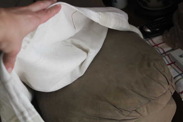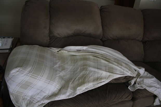 Tome el extremo equipado de una hoja inferior a los apoyabrazos de su sofá, medir desde 3" a 6" de material adicional en los lados del brazo, dependiendo de su sofá y cuánto necesita cubrir y el abdomen.