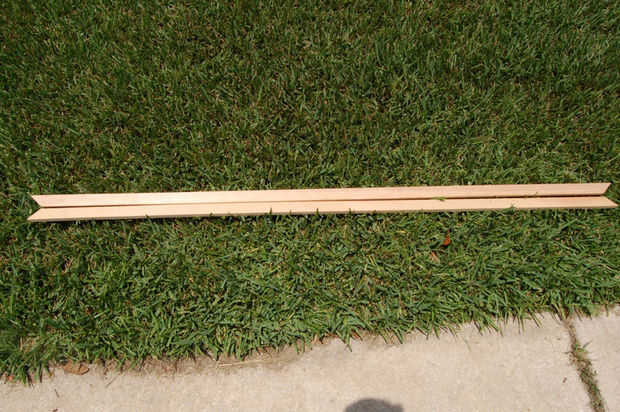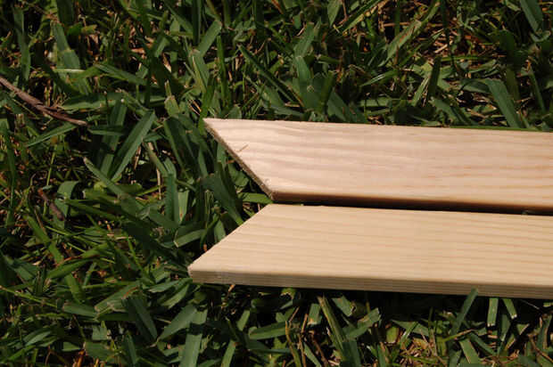 Conjunto para cortar ingletes sierra a 45 grados y cortan un ángulo en cada tablero. Asegúrese de que usted realice el corte del mismo lado de cada pieza. Usted debe convertir cada tablón en un trapezoide. Si tienes miedo que puede hacer un error, dibujar las líneas de corte y todo para asegurarse de que encajan en un rectángulo de línea. Hacer los cortes como cerca del extremo como sea posible, para que tengas algunos triángulos poco agradables para usarla más tarde.