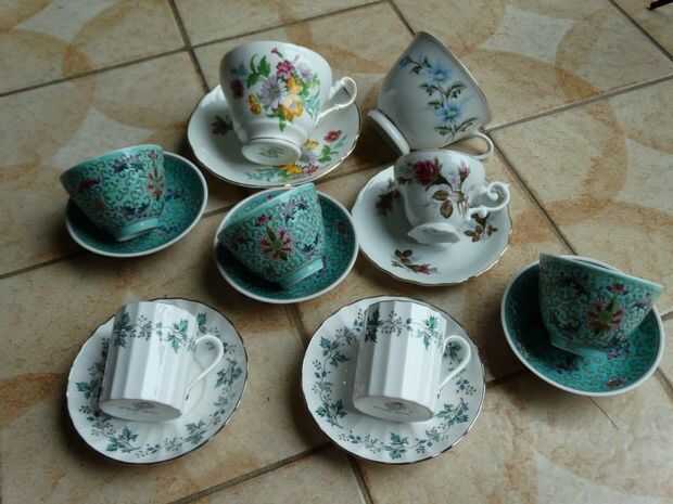 Recibí un montón de tazas de té y platillos de la misma venta donde obtuve los candelabros... Bastante dulce. Quería usar tazas de té no coinciden / platillos. Fuera de las tazas de té en la foto, elegí 4 usar (ya que tengo cuatro espacios de la vela en mi candelabro) y lencería desconjunta sus platillos. Ayuda si usted tiene el candelabro con usted cuando está recogiendo las tazas de té y platillos porque entonces usted puede asegurarse de que las tazas de té y platillos se ajustan en el candelabro. Espacios de mis candelabros vela son tipo de juntas. Así que no puedo utilizar los platillos más grandes en este proyecto porque no caben en el candelabro. Tengo que usar un plato más pequeño con las tazas de té grande. Esto no es un problema ya que estoy uniendo mal té tazas/platillos