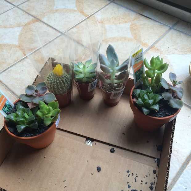 6) suculentas/cactus - un cactus o suculenta para cada espacio de la vela. Tengo una taza de té grande y tiene una olla de 3 pequeñas suculentas para esta taza de té.