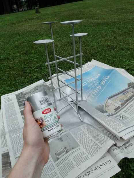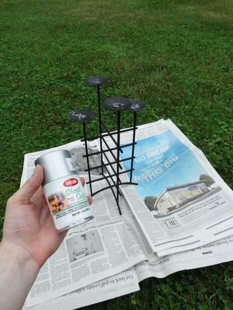 En un pozo ventilado espacio (exterior es mejor!) siga las instrucciones en su pintura pueden pintar los candelabros todo. Lo mejor es mantener puede unos 10" lejos de ella y hacen algunas capas de pintura en lugar de sostener la lata muy cerca de los candelabros y haciendo 1 capa de pintura de luz. Probablemente esto será escrito en la etiqueta de tu can también para su referencia.