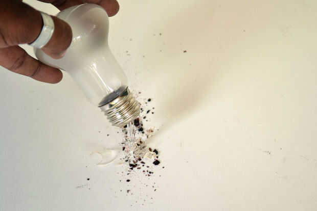 5. después de que ha retirado el pedazo grande de vidrio en la bombilla a ellos el resto de los contenidos en un pedazo de alfombra o papel han extendido hacia abajo.