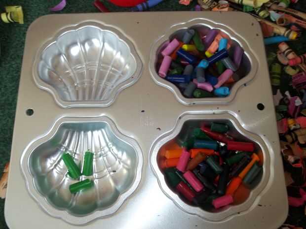 a continuación, pelar cada crayón individual. Esta parte deja hasta la fábrica de combinar distintos colores. Es útil romper las crayolas en trozos pequeños como se muestra a continuación para ayudar a la cera a derretir, cuando esté listo para fundir. Como están llenando los moldes de caramelo Recuerde que puede utilizar más de un lápiz de color en el molde para crear un efecto colorido swirly cuando apareció. Véase abajo por ejemplo.
