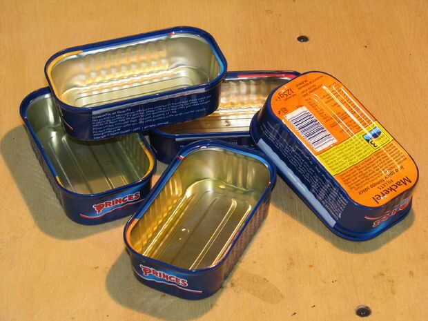 Tomar caballa vacía cinco latas. Si la caballa no es el pescado de elección, latas de sardina o sardinas sería igualmente en casa en este proyecto. Usted también necesitará una manera de pegar las latas juntas. Una pistola de pegamento caliente es el arma ideal para usar aquí.