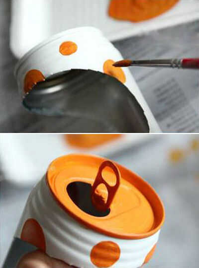 Pintura redondo círculos de color naranja en lata. Entonces la pintura naranja para la tapa.