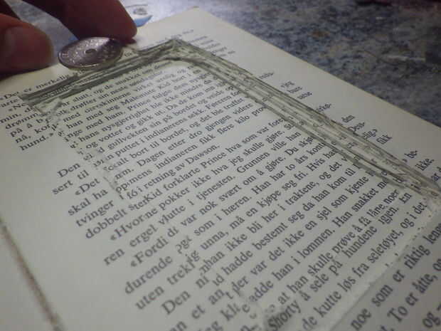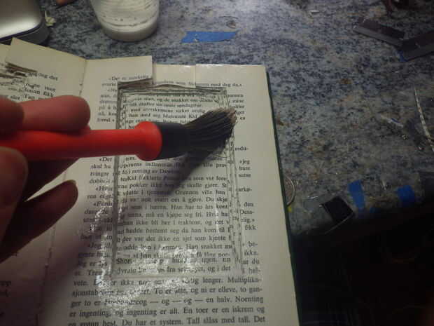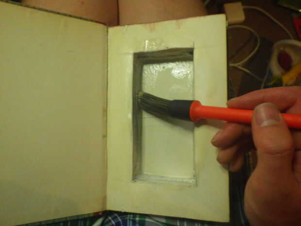 Este es el paso más largo y más difícil. Este paso tiene que esperar hasta que el pegamento si completamente seca. Primero marqué donde yo tenía que para cortar. El piggybank tuve hacer una ranura para el efectivo. Tomé la moneda más grande que tenía y una marca, que debe ser la ranura de moneda. También hice el Dpto. del vientre más grande entonces la ranura para que las monedas no caen como fácil hacia fuera. Lo hice en ambos lados del papel cera de Córcega después de que fue quitado (el papel de cera). Luego pegué todas las páginas y las esquinas. Entonces me aseguré que todo se veía bien antes de poner predicador en él por última vez.