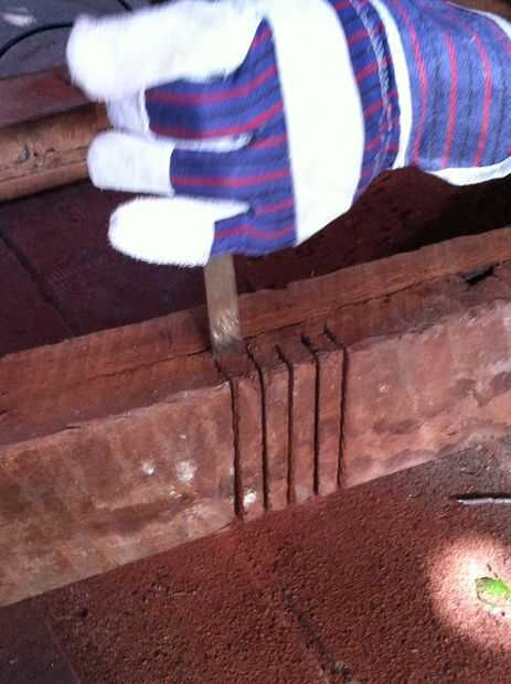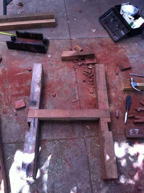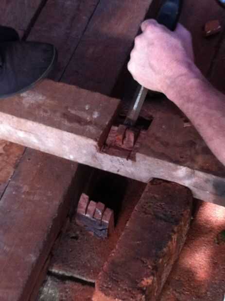 Cortamos una sección de cada viga y pierna en el punto que se unieron para arriba. Había muchos de ellos. Voy a condensar este paso a una serie de fotos. Había cincelado por las secciones y verificar que las piezas encajadas entre sí. Si no utilizamos el raspador y un poco de percusión para persuadir a las piezas que encajan entre sí. Marcada cada pieza nos fuimos así que sabíamos que haces conexión a que piernas etc.. La mayor parte de la tarea de construir el Banco estaba en la corte medición y cincelado a mano de estos controles.