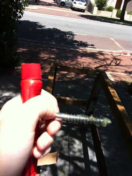Mismo proceso que antes pero con los dos lados por las vigas del lado más cortas. El Banco sostiene juntas y soportes uprght antes de refuerzo. Utilizamos tornillos como antes en los tornillos inferior apoyo viga y entrenador en la viga superior (previamente lubricada).