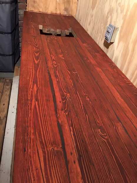 Por desgracia, no tengo ninguna fotos reales de este proceso. Pero aquí es donde algunos gran transformación tuvo lugar. Un amigo tenía un relleno de madera negro. Empezamos llenando pequeños orificios y grietas, pero creció rápidamente a donde estábamos que esencialmente cubre la parte superior entera con el relleno negro. Este enfoque integral nos permitió llenar los agujeros de clavo viejo, las grietas naturales de la madera, las costuras y los puntos bajos en la madera. Esto también significó que tuvimos que lijar la masilla para madera negro exceso retroceden. Hemos perdido un poco del personaje en este segundo paso lija (p. ej. marcas de sierra) pero realmente sacó de algún otro personaje que no hubiera sido tan obvio sin este paso.