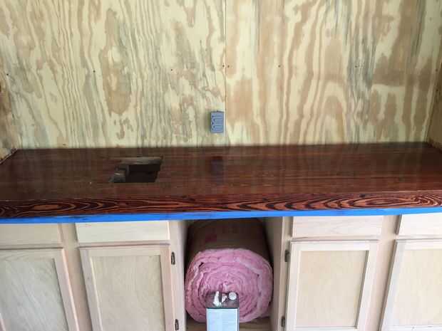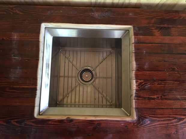 También tuve que incluso hacia afuera del borde inferior de la madera para que el fregadero debajo-monta sentaría semiempotrado contra él. El desnivel de la cubierta entró en el juego otra vez y requiere un trabajo extra...