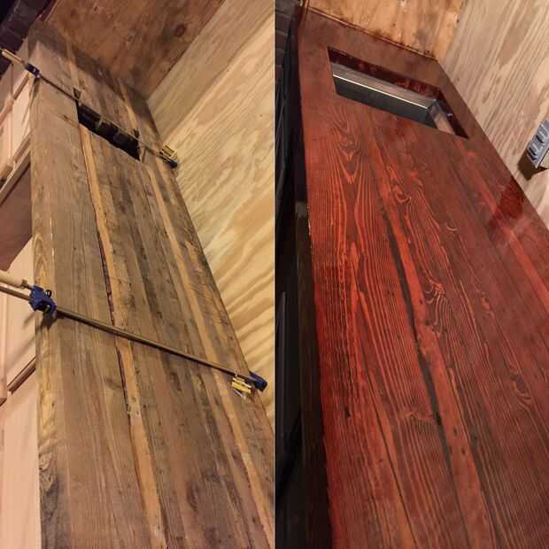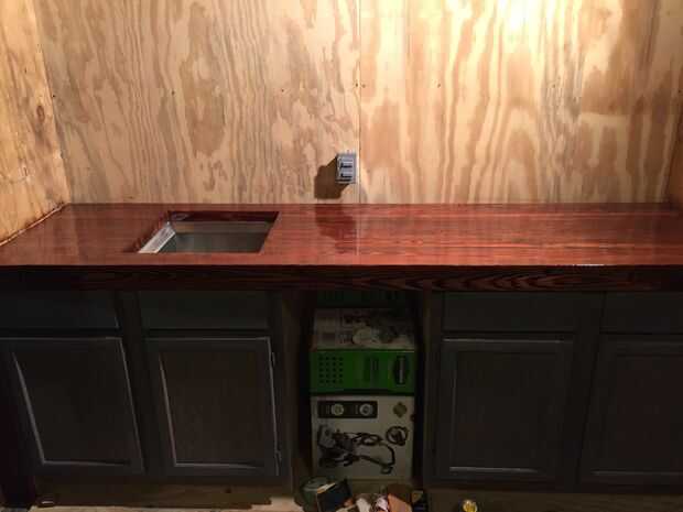 Después de seco el finales capas de poli he instalado el fregadero del undermount con soportes y un grueso cordón de silicona. La silicona es importante asegurarse de que no hay agua lo convierte en grietas entre el fregadero y el bartop. También, disfrazada de la desigualdad restante. También llené en cualquier restante pequeños agujeros / grietas en la veta con silicona.