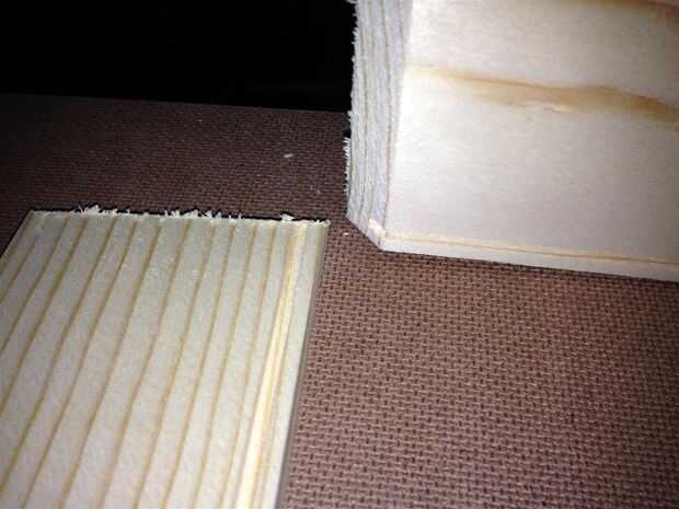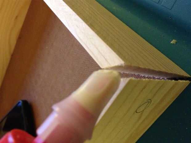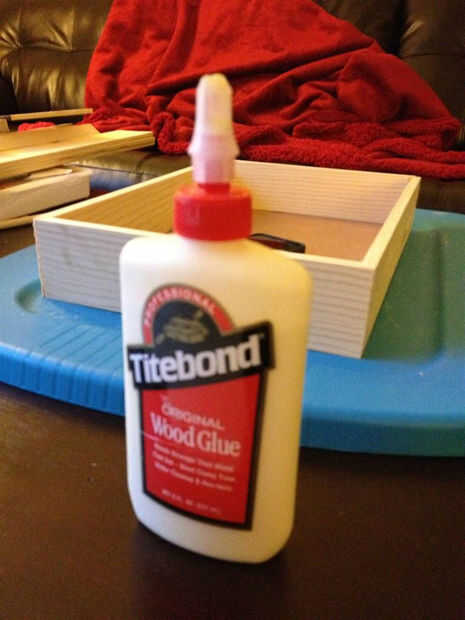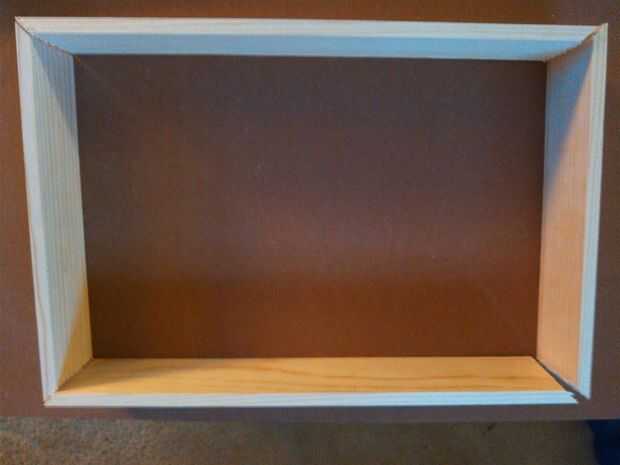 Pegué tres lados de la caja en los cortes de 45 grados. Luego medir y cortar un trozo sobrante de masonite para la base de la caja. Para asegurar un ajuste apropiado, mida el masonite después de arreglar la caja como va a ser.