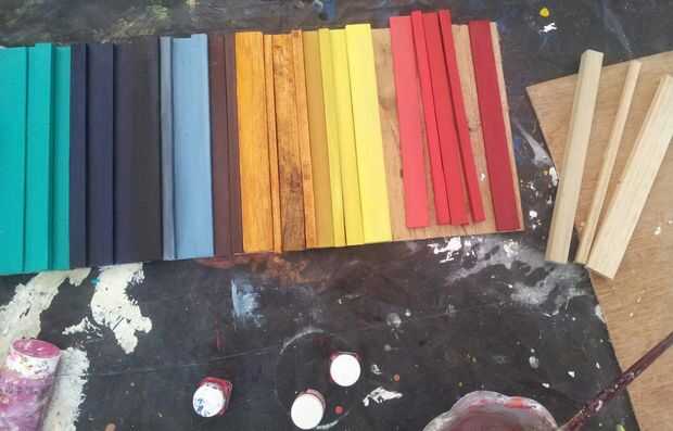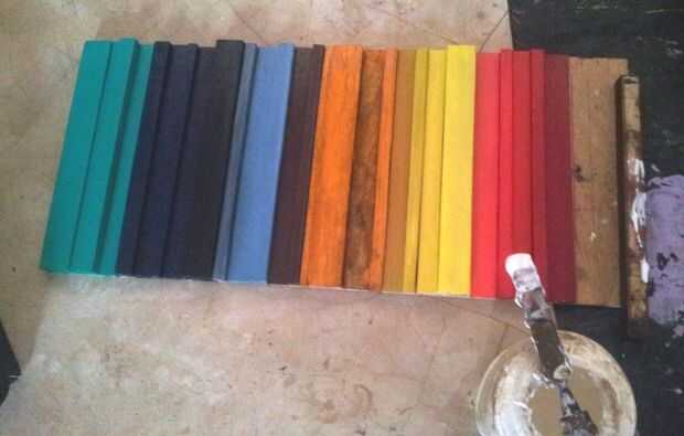 Tuve un esmalte caoba oscuro pintura que parece marrón chocolate. Cargar un trapo con aguarrás, sumergirla en un poco de la pintura de esmalte y frotar sobre los listones restantes. Lo que obtendrás es una hermosa mancha de madera marrón chocolate. La veta de la madera muestra maravillosamente. Así que básicamente si quieres tinta para madera en un color particular, revisa las opciones de pintura de esmalte. Usted pierda menos pintura. No necesita usar un sellador lijado y obtienes un buen teñido final.