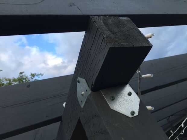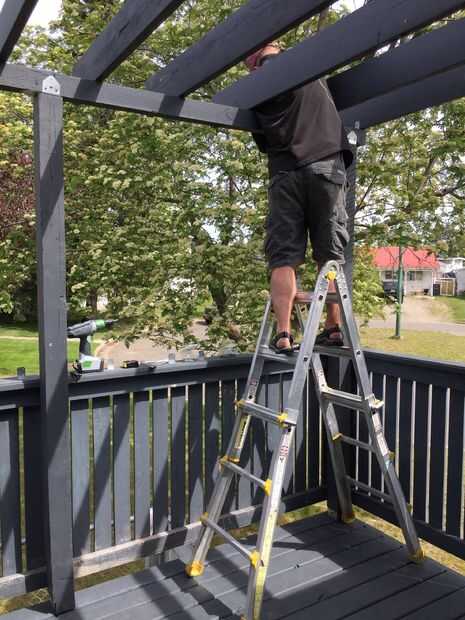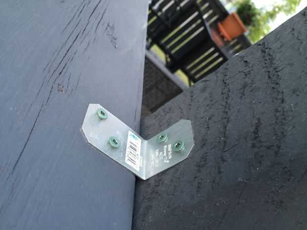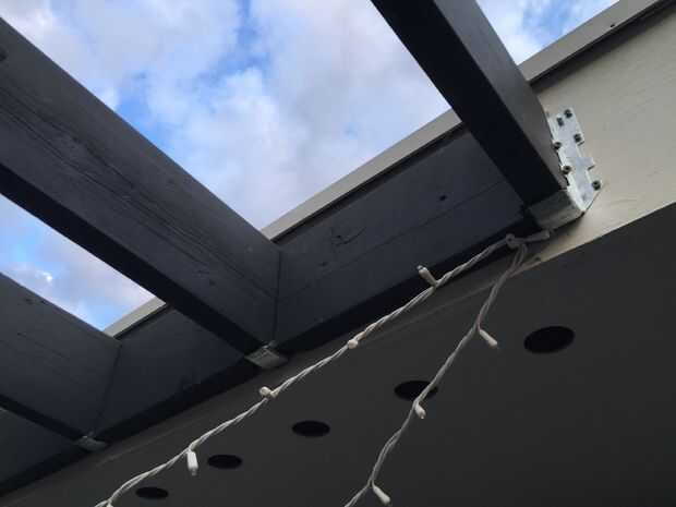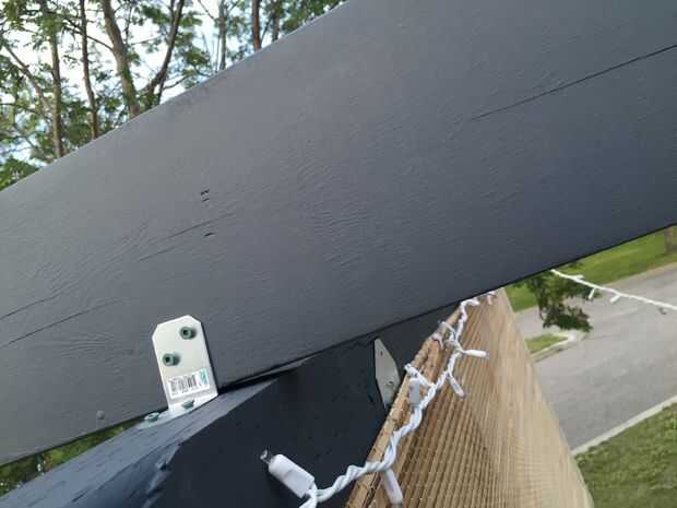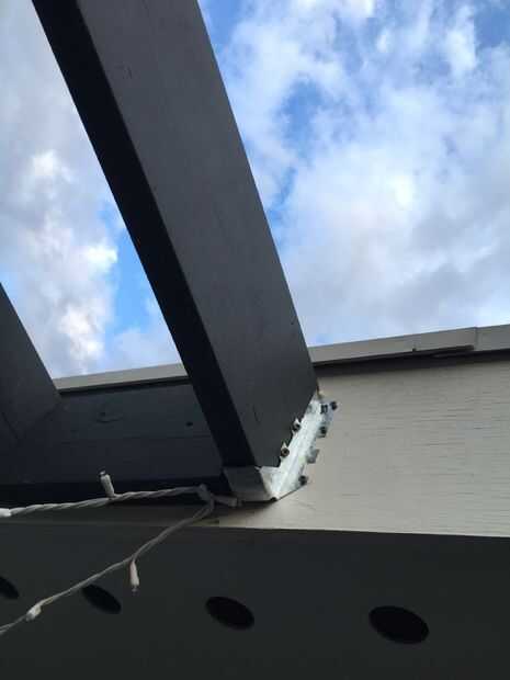 Una vez que las suspensiones fueron colgadas, las vigas se acercó, un extremo sentado en la percha y el otro en la parte superior del travesaño de apoyo. Las vigas fueron intervenidas en su lugar a tope contra el techo vísperas tanto como sea posibles (un ligero ángulo fue cortado para tratar de coincidir con el extremo de la viga con el ángulo de las vísperas de techo para una colocación al ras) y atornilladas en su lugar. Entonces nos jodidos los soportes en L en el lado de cada viga donde alineado sobre el travesaño de apoyo. Mide una distancia igual entre cada viga, alrededor de 16" y atornillar la abrazadera en L en la viga transversal de soporte para fijarlos.