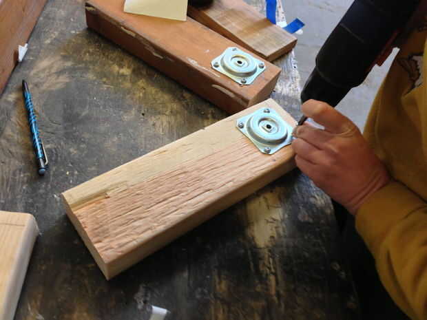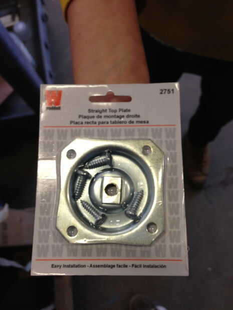 Las patas que hemos comprado tenían tornillos que salen de la parte superior que se adhieren a las placas superiores. Atornillan las placas superiores en cada soporte de las patas de 2 x 4, luego coloca el 2x4s de modo que las piernas en cada esquina de la mesa y atornillan en su lugar.