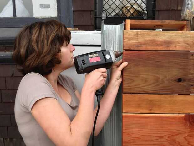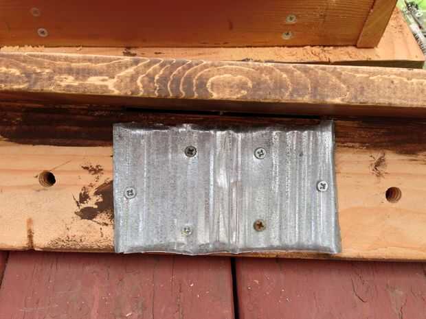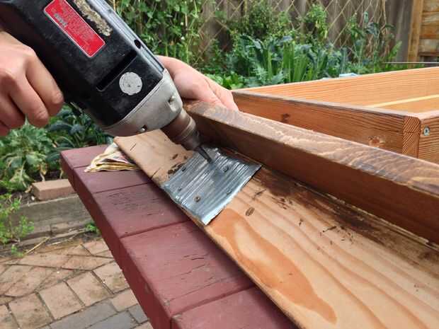 Cortar el canalón a medida. Fijar el canal será más fácil si las 4 piezas del tableros son desmontadas. Agujeros para los tornillos en la cuneta cada pie o algo así. Utilice tornillos cortos para conectar un lado y luego coloque la otra mitad mesa en un ángulo, doblado aparte, la forma de U del canal para que pueda alcanzar su destornillador para atornillar en la cuneta a la otra mitad de la mesa. Luego vuelva a la mesa. También ponemos los rectángulos pequeños desechos de metal en nuestros delantales exteriores donde tocaría el canal para que la madera sería un poco más protegida de pudrición.