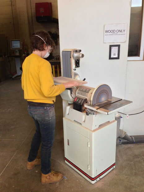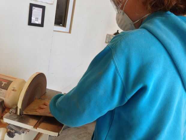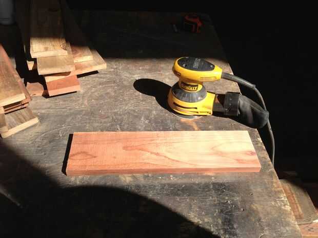Para las caras de la madera de la arena, se utilizó una lijadora de Palma orbital al azar en grano 80. Hicimos los bordes con la lijadora de banda y los extremos con la lijadora de disco para hacer las cosas rápido, pero si no tienes acceso, sin duda puede hacer su lijado con una lijadora de Palma.