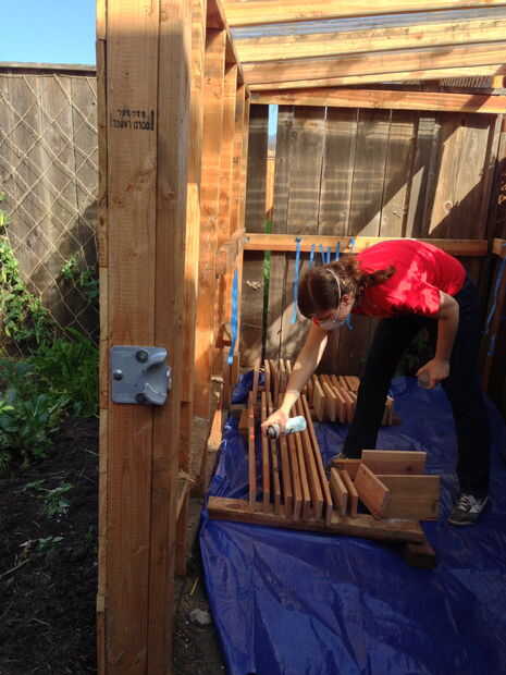 Primero rociaron un borde de todas las tablas, entonces después de nuestros diez minutos secado tie, cada tablero para rociar el rostro, luego otro borde, luego la otra cara y por último, cada extremo. Asegúrese de que usted está dar vuelta cada junta en la misma dirección para no perder pista de lo que las superficies le ha rociado y lo que no lo has hecho.