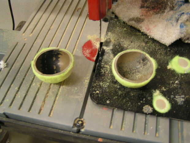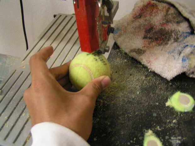 Generalmente, pasador se viene en longitudes de 3 pies, así que probablemente tendrás que cortar. Necesitarás tres piezas de espiga larga de 18 pulgadas. También, corte tanto de las pelotas de tenis por la mitad con una sierra para metales o una sierra de banda