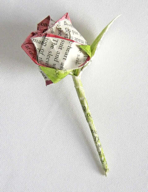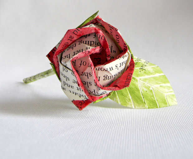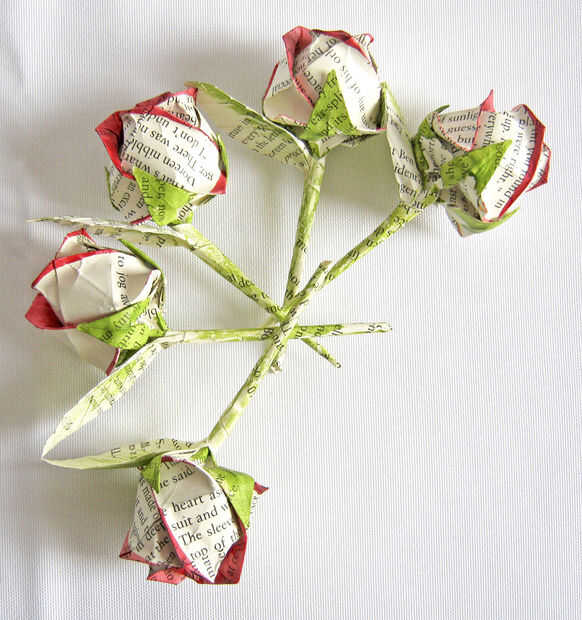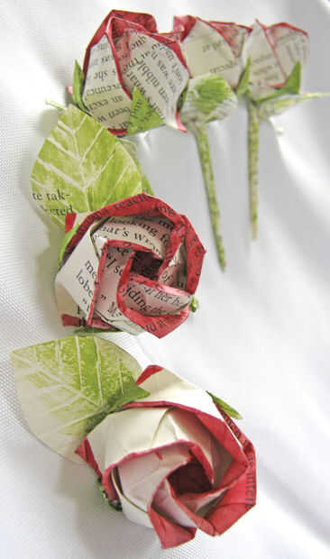 esto es un conjunto de origami rose o hice. Están fabricados de las páginas de algunos libros antiguos dañados, pintados para agregar color y rociados con un spray de acabado para pinturas hacerlos resistentes al agua. También hacen pins de gran sombrero.