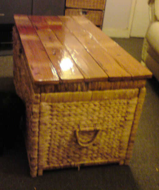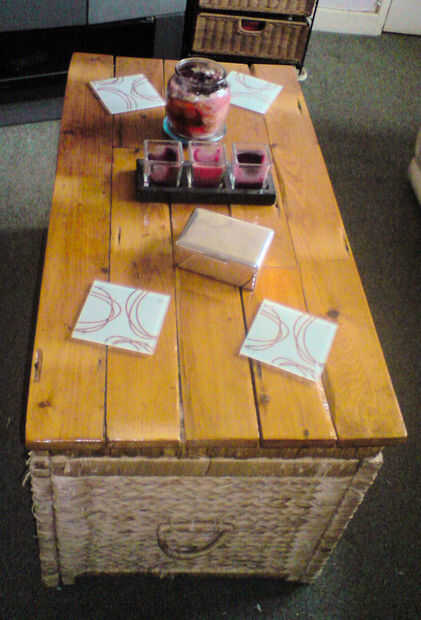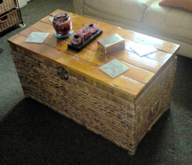 Cabe señalar que teniendo en ming que la madera era todo libre el pecho estaba libre de las ruedas fueron gratis el coste total para la mesa del lado, DVD estantes, estantes para libros, mesa de centro, tórax y la parte superior del compañero era menos de £10 para pegamento, tornillos y barniz