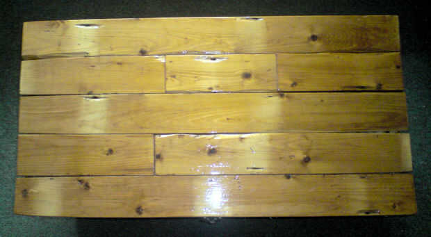 Una o dos horas de lijado hacia abajo trajeron el reverso de las tablas del suelo por gran, mantuvo junto con algunas cintas de tapicería luego atornillado a través de un par de listones dentro de la tapa de pecho para arriba en las tablas para garantizar que la parte superior, unas ruedas de un viejo soporte de la tv Mantenga las patas de unos 6 mm del suelo por lo que todo el asunto completamente cargado se puede mover con un dedo pero parece que está parado en los pies del pecho.