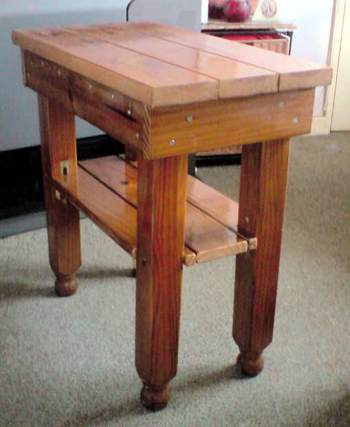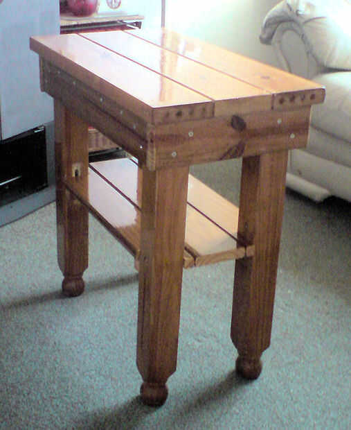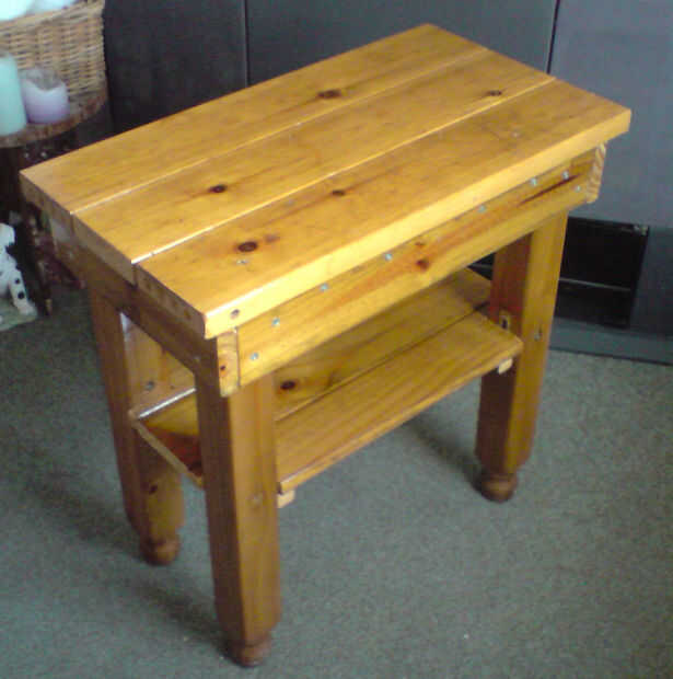 Una vez que todas las piezas habían sido desmanteladas, limpiadas y deja para secar el primer proyecto fue una mesita para mi portátil, necesitaba una tabla mayor que había podido encontrar localmente por lo que era tiempo para presionar a algunos de este hermoso pino en servicio somos ambos muy aficionados el rústico buscar en nuestros muebles hasta una mesa de pino simple de dos de los rieles laterales y cuatro de las patas de nuestro marco de la cama de cucheta funciona muy bien para nosotros.
