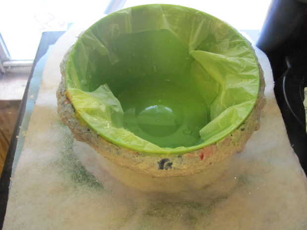 Voltear el tazón de fuente sobre y la ONU-cinta la bolsa del recipiente.  Deslice el recipiente hacia fuera.  Lentamente retire la bolsa plástica de la taza de papel.  El interior del tazón de fuente nuevo estará húmedo.