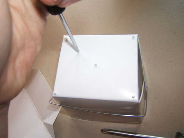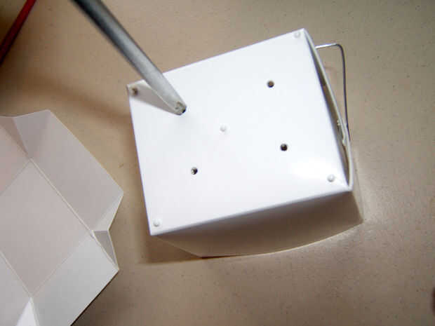 Poke algunos agujeros en la parte inferior de la caja con el destornillador o punzón. Me pareció bueno poner estos agujeros entre cada pin de la esquina y el pasador central. Esto se ve agradable y simétrico.