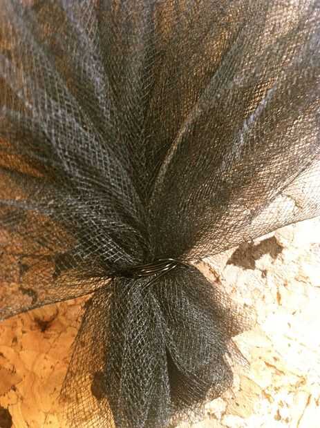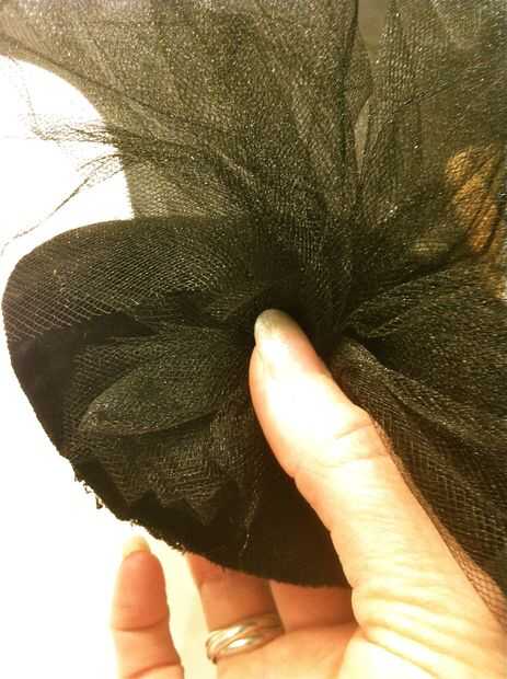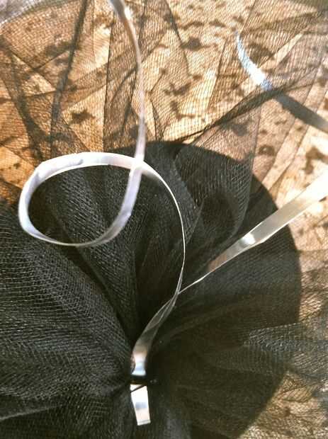 Puedes bling este bebé para arriba sin embargo como, pero aquí está algunas ideas basadas en cómo lo hizo mina... juntar lazos de tul, lazos seguros con alambre... caliente pegamento tul al sombrero, cubriendo la costura... prensa hasta que cuaje.  Tuck en adornos... Usé un recorte de la placa de la empanada que rizado y se deslizó bajo el alambre... También he añadido unas plumas más adelante.