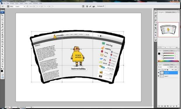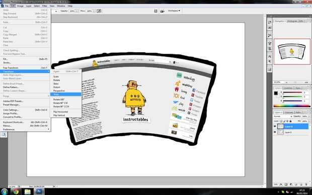 Coloque su dibujo en la parte superior y vaya a Editar > Transformar > warp. Ahora la deformación superior e inferior de la imagen, hasta que coincida con el análisis que se tomó. Prueba y asegúrese de que ningún marcador negro es visible, asegurándose de que hacer imagen de yout tan cerca el mapa como sea posible.