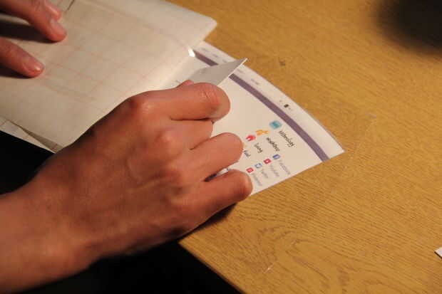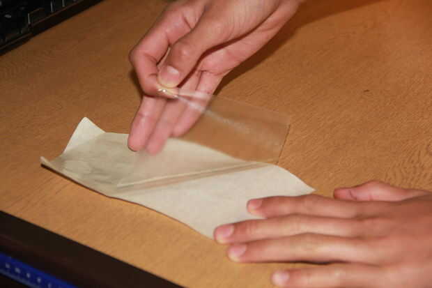 Coloque su diseño bocarriba en la mesa de trabajo y empezar a aplicar la película sobre el diseño. Usé una tarjeta de crédito para ayudar a alisar hacia fuera y asegúrese de que no hay burbujas.