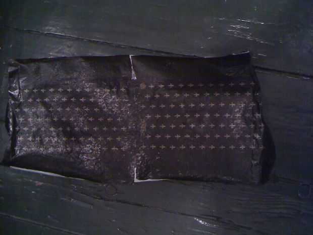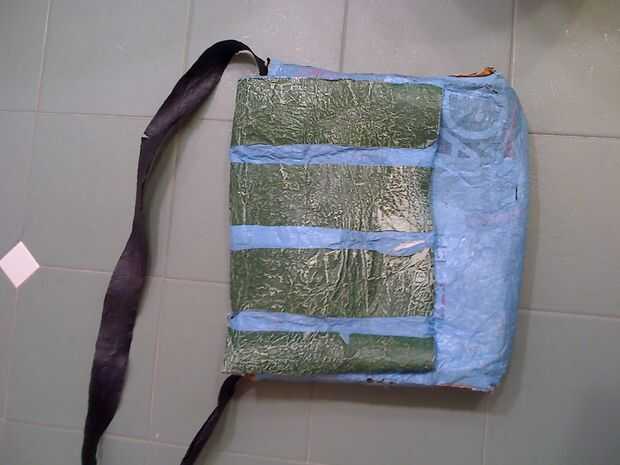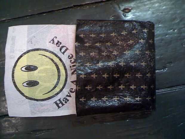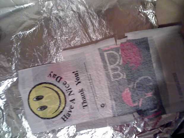 He cubierto un lado de la hoja (que será el exterior) de lujo bolsas de oro-patrón de la tienda de licor. También puse una carita feliz en lo que se convirtió en el interior de la aleta. Cortar una bolsa en tiras y poner rayas de colores en mi primera bolsa de mensajero.