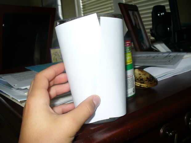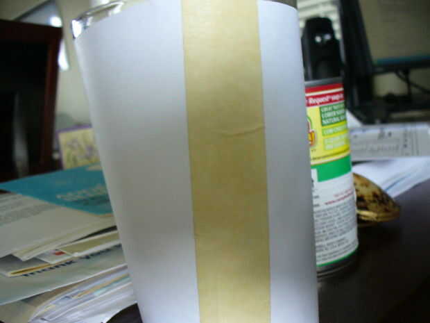 Si el bote es realmente amplio, deberá cortar otro pedazo de papel a la misma altura, de manera que alcanzará todo el camino alrededor de la olla. Si está usando dos piezas de papel, cinta adhesiva ahora. Envuelva el papel alrededor de la olla y la cinta juntos, preferiblemente con cinta de enmascarar. Dejar abierta la parte inferior por dos razones. La primera es que la luz no puede conseguir en la parte inferior, por lo que es innecesario. La segunda es que podrás ver el om bott, para saber si la planta necesita agua o un transplante o algo.