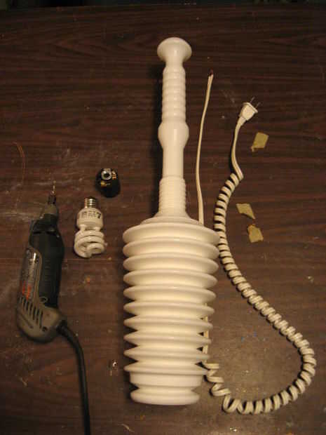 Necesita un destapacaños, este también tuerce abierto. Cable de la lámpara, zócalo de lámpara y un zip de lazo (no en la imagen) y una dremel con una broca pequeña adjunta. Una bombilla de 9 vatios CFL.