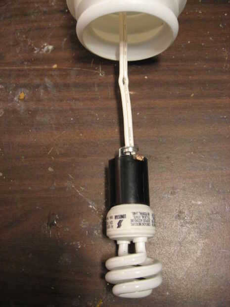Cable de la lámpara a través del émbolo del hilo de rosca. cable de la lámpara tiene un alambre liso que debe conectar al tornillo oro Zócalo y otro cable conecta con el otro tornillo. Le puse pegamento caliente sobre los tornillos para no conseguir socked más adelante. Enrosque el foco CFL en.