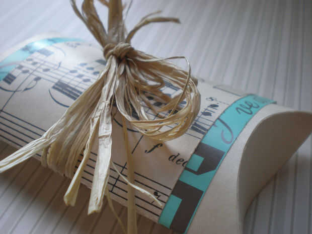 Decoración opcional se puede Agregar usando retazos o pedazos de papel reciclado para mejorar el paquete. Usé un pedazo de envoltura de papel, un trozo viejo de partituras y algunos rafia para añadir un poco de color y textura a mi almohada. Si desea utilizar dos pedazos de papel como utilizo las siguientes medidas: