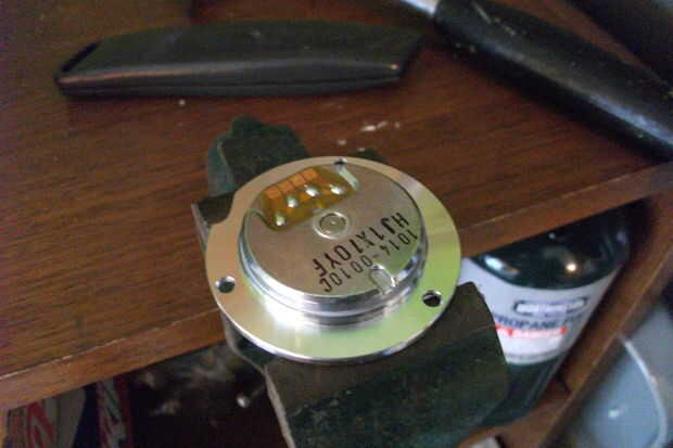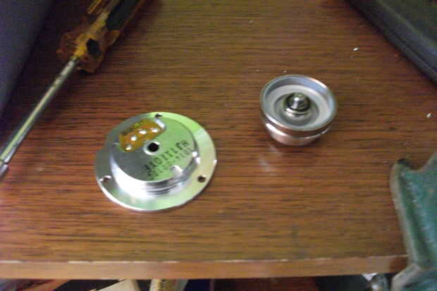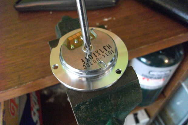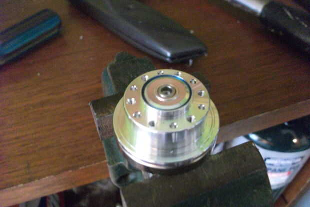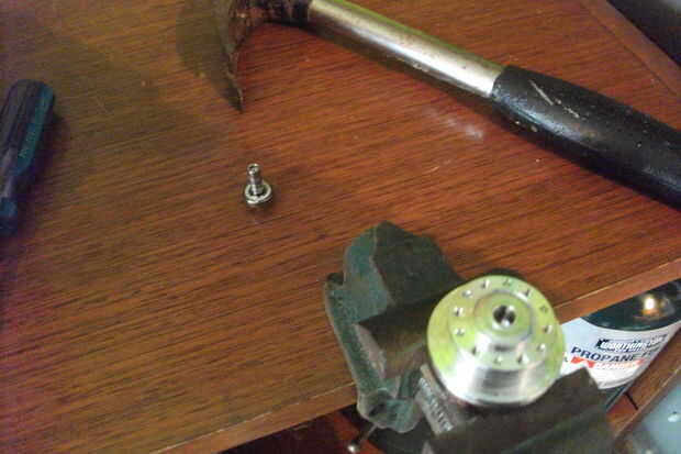 Coloque el ensamblaje del motor boca abajo en un tornillo de banco (preferiblemente rellenada) con la parte de spinning colgando libremente. Coloque un destornillador viejo o algo por el estilo en el centro y golpéela con el martillo. Finalmente, la Asamblea de spin entero caerá. A veces este paso tiene dos grifos, a veces tarda diez minutos. Ser paciente.