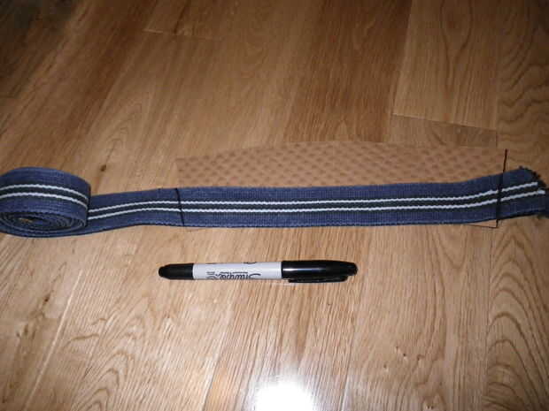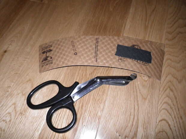 Difundir el cinturón sobre el acogedor corte. Para asegurar el ajuste correcto de tu acogedor en la taza de café Alinee la parte inferior del corte cómodo (ver imagen) con el borde inferior de la correa.