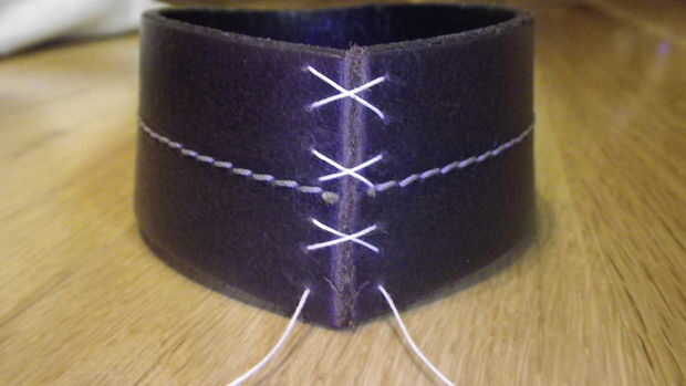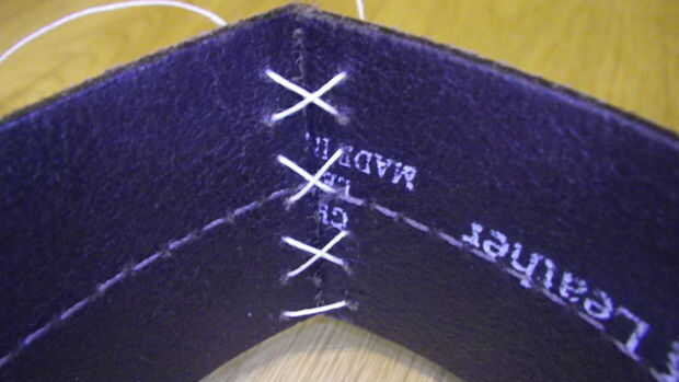 Trabajar su camino de arriba a abajo 'atar' el cinturón utilizando la aguja para tirar el hilo a través de los agujeros (utilicé una aguja que constantemente tenía que volver a pasar. Si se va a utilizar dos agujas que se arreglaría este problema).