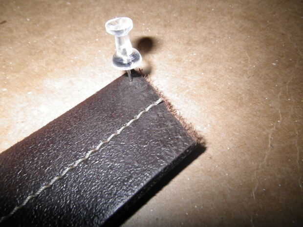 Tomar su tachuela y su correa de cuero cortado en forma de plantilla (igual como se ha visto con la correa de la tela). Asegúrese de que colocar el cinturón sobre una superficie sólida, teniendo en cuenta que usted puede empujar a través con la tachuela.