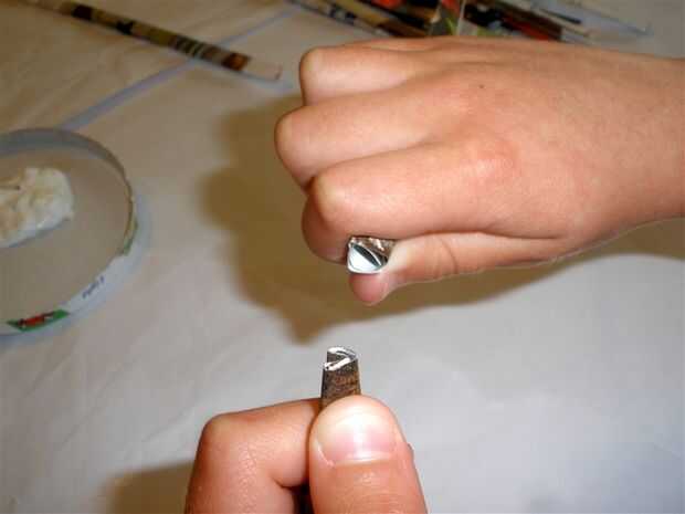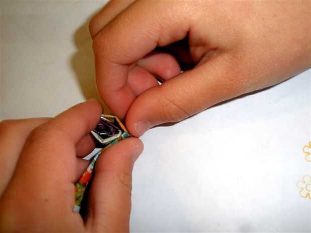 Comenzar empujando las tiras en una otra. Para ello, V-doble un extremo de una tira y deslícelo hasta alojarlo en un segundo tiras finales. Podría pegar cada extremo de la tira antes de colocarlos juntos, pero mis hijos y yo lo hice al azar para ahorrar tiempo.