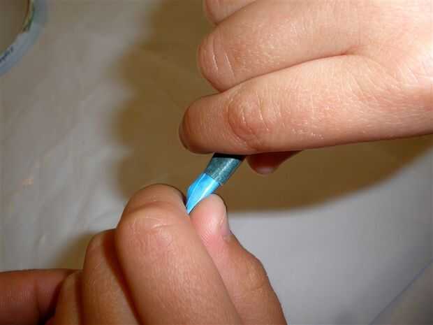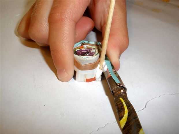 Comenzamos con una cadena de tres tiras para iniciar el bobinado. Sólo balanceo encima de la tira, usted comenzará en el centro de la base del recipiente y trabajar hacia fuera.