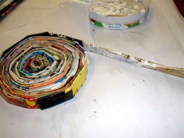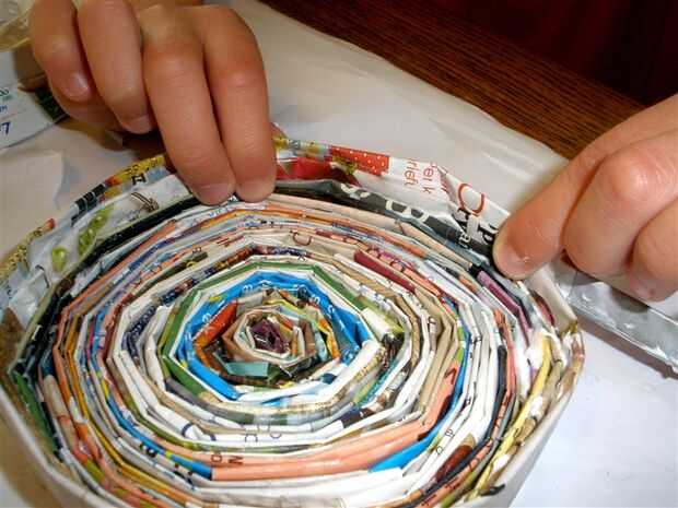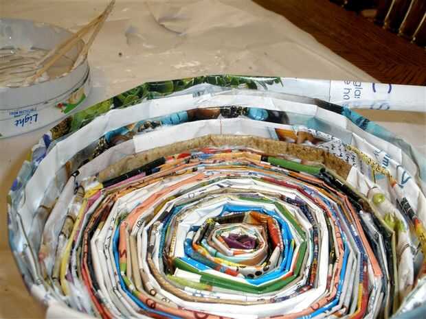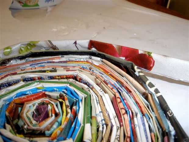 Continuando alrededor de la última tira en espiral en la base, comenzar a envolver la tira siguiente, a medio camino encima de la fila anterior.
