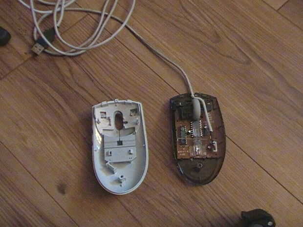 Primero debe quitar el tornillo o tornillos de la parte posterior del ratón y quitar los componentes. Si el cable está conectado a la placa de circuito, retírelo. Si se suelda, cortarlo. Entonces dejar de lado la placa de circuito.