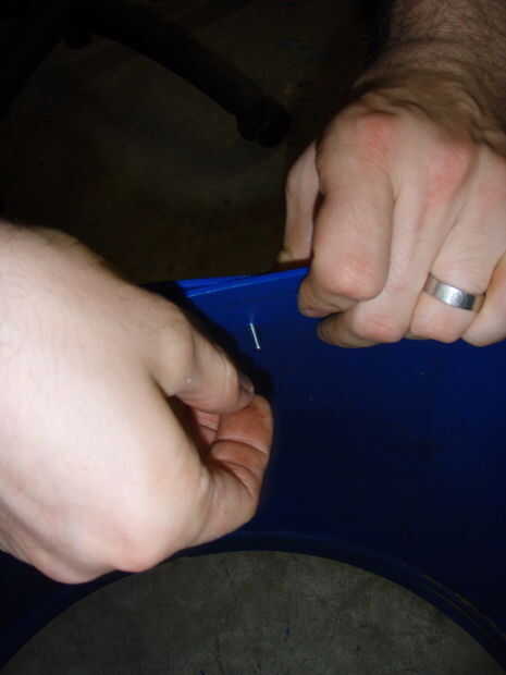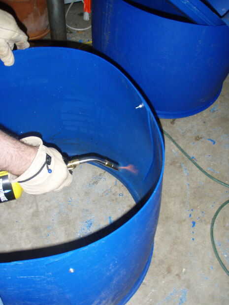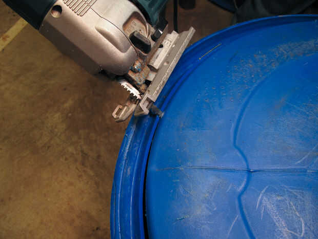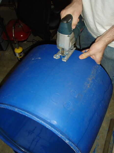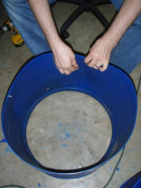 Gire el anillo de base su lado y haga dos marcas cerca de dieciséis pulgadas aparte 10" abajo de lo que solía ser el centro del tubo y corte a lo largo de estas líneas. Configurar el barril, primera fila hacia abajo.
