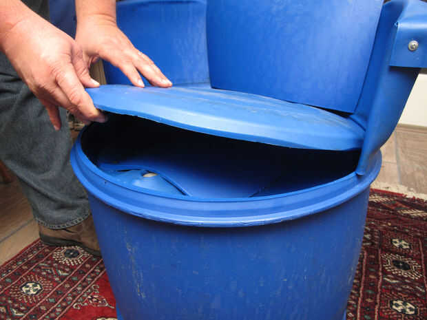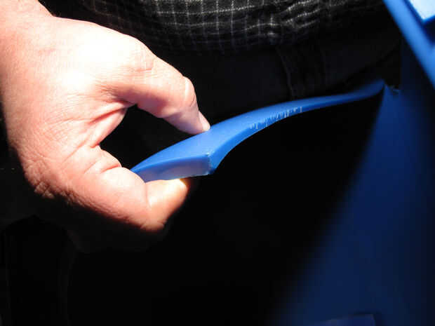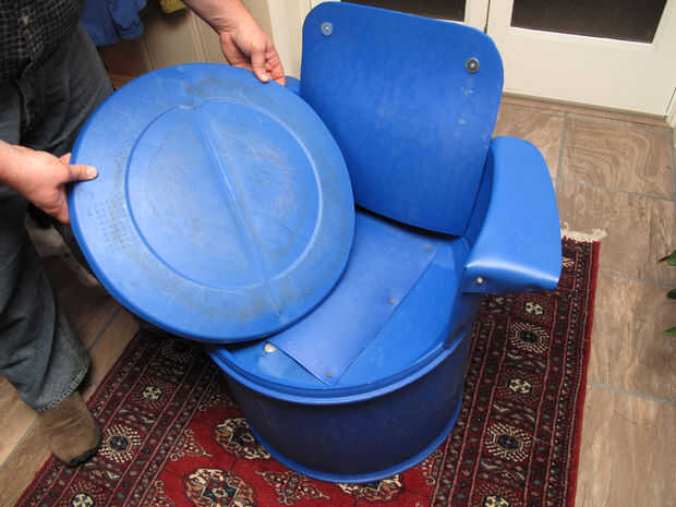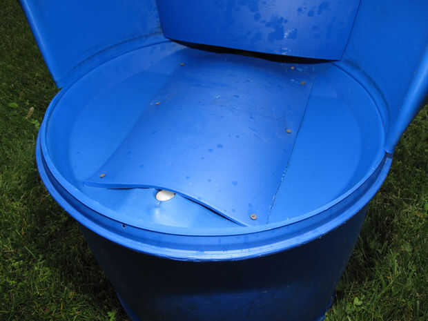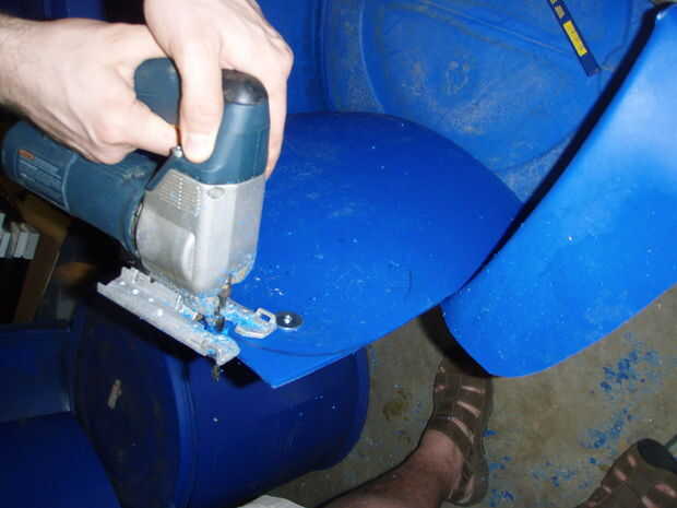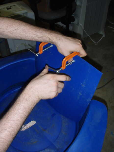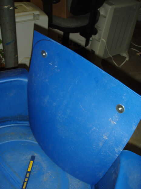 Ahora vamos a montar el 12" pieza en el asiento de la silla, esto le dará nuestro asiento apoyo extra y algunos «primavera». Encontrar el borde grueso, la parte que solía ser una parte del anillo del cañón y colocarlo cerca de la parte delantera del asiento con el arco subiendo. Esencialmente estamos abarcando la distancia entre las canillas con esta pieza. Una vez que lo tienes colocado, asegúrelo con 1" tornillos de panel de yeso.
