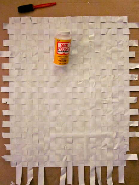 Voltee su papel tejido. Aplique pegamento en el lado blanco del papel con un pincel (yo usé Mod Podge y un cepillo de espuma). Entonces puso un pedazo grande de papel usado sobre la parte superior de la cola. Esta dará su papel un poco más de fuerza y ayudar a prevenir su tejido de deshaciendo.
